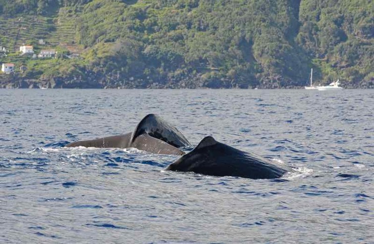 Two sperm whales about to dive. Notice how close they are to the shore.
