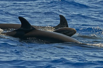 False killer whales (pseudorca crassidens) are long dark torpedo-like animals with a slim head. Females can reach 5 metres and males 6 metres. They mainly eat squid, but they sometimes attack other cetaceans.