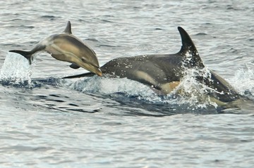 Common dolphins (delphinus delphis), mother and calf. At birth, common dolphins have a size of 80-100 centimetres, which is much compared with their mother's length (210-230 centimetres).