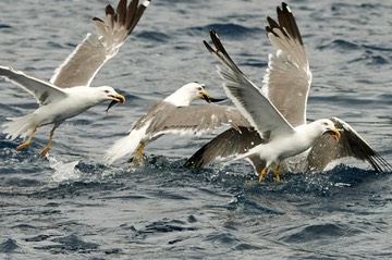 European herring gulls (larus argentatus) on a banquet of jack mackerels off Lajes do Pico.The fish are carried to the surface by predators like dolphins and tuna.