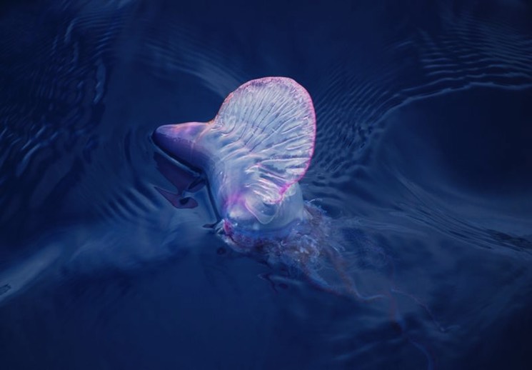 Man o' war (physalia physalis). It looks like a jelly fish, it hurts like a jelly fish, but it is not a jelly fish. It is a colony of minute animals.