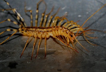 Centipede (scutigera coleoptrata). The venom is delivered through the forcipules (the leg-like claws under the head). They are not considered dangerous for humans.