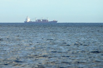 On the horizon, the silhouette of a ship is deformed by hot air currents.